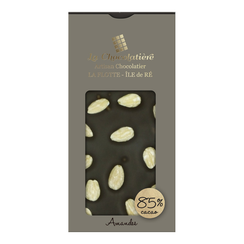 Tablette de Chocolat 85% cacao avec morceaux d'amandes. Fait maison.