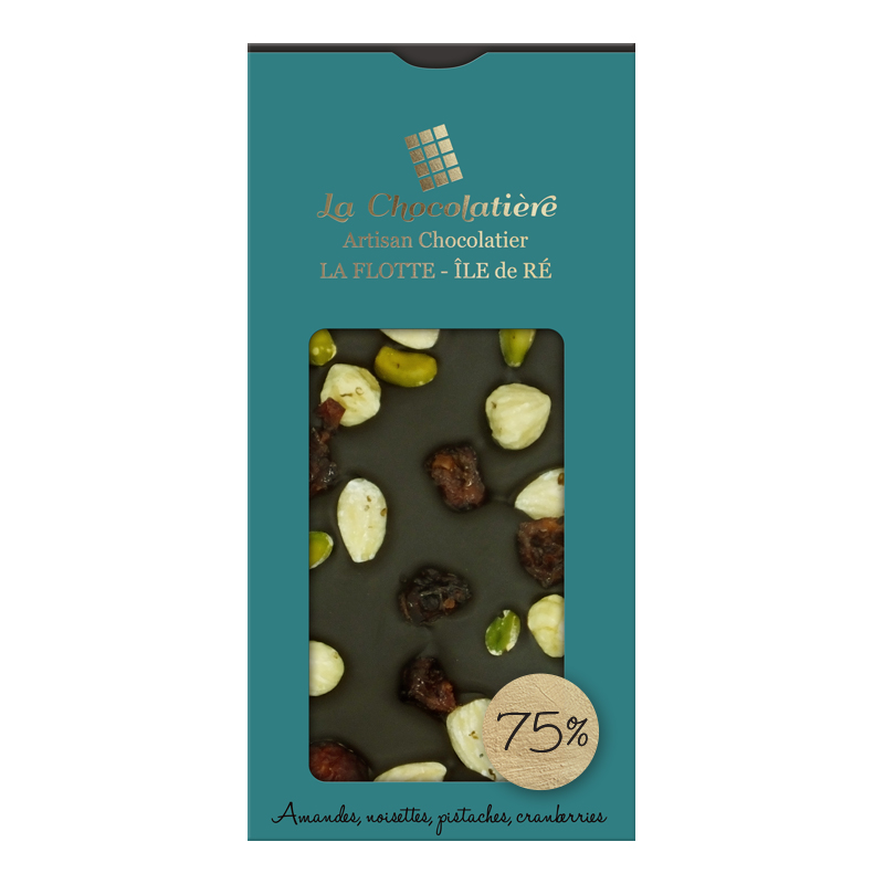 Tablette de chocolat 75% de cacao garnie d'amandes, noisettes, pistaches et cranberries. Fait maison.