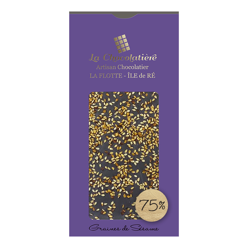 Tablette de Chocolat 75% de cacao parsemée de graines de sésame. Fait maison. Couleur packaging aléatoire.