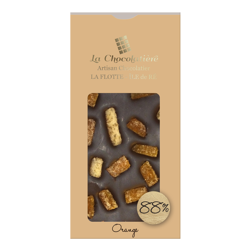 Tablette de chocolat 88% de cacao garnie par des morceaux d'orange. Fait maison.